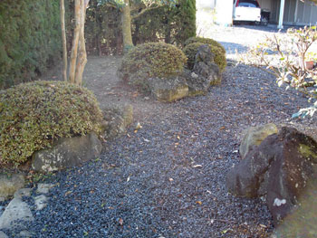| 建物廻りは砕石敷です。沓脱ぎ石も見切り石もグレー系の石で統一しました。 |