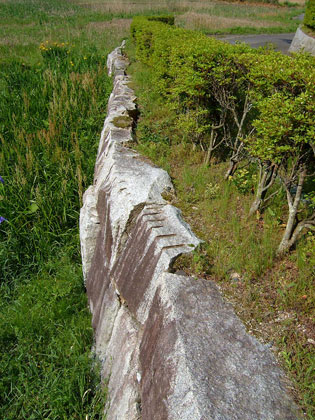 | 地面が石積みを30〜60センチ南に押出し、その上、石を起こし土は戻り、隙間ができた。石積み修復工事 |