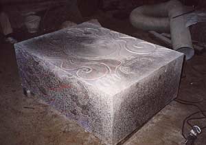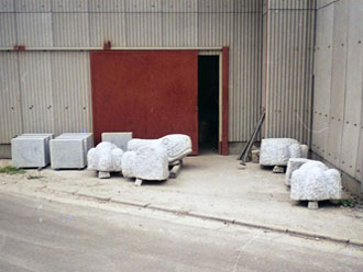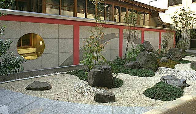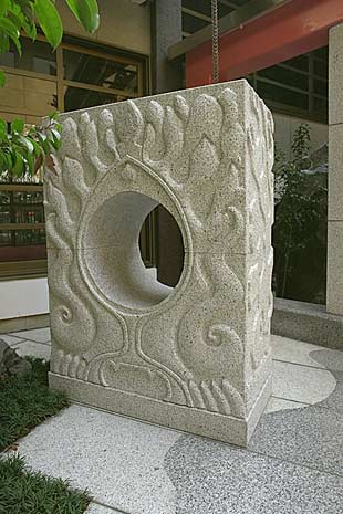 | 赤坂豊川稲荷平成の庭です。 壁面を生かしての芸術。 稲田御影石で作成しました。叩き仕上材と磨き材で 表現しました。 磨いた板石をライン部分を残し周りをタタキで落し ました。 仕上げ(加工)方法で表現したものです。 右の火炎灯籠も稲田御影石で作成。 足元の敷石ですが、壁面と同じ仕上げ方法で動きを 表しております。 当社の前身であります昭和石材社で加工しました。 火炎灯籠の製作中の写真が有りました。 |