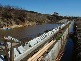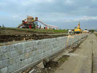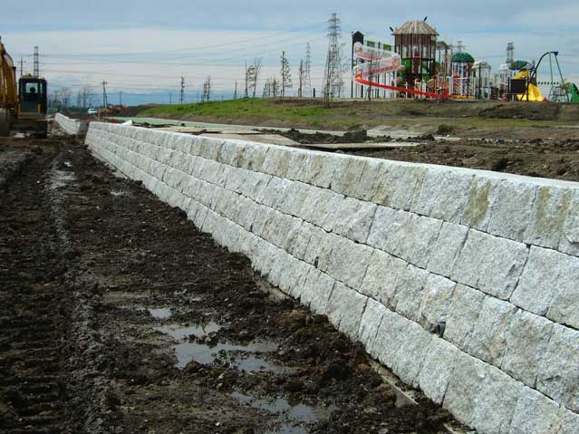 | 稲田みかげ石の間知石による石積が終了しました。 場所は埼玉県にあります、しらこばと公園です。 総長550メートルになるという石積みです、出来上がりを眺めると見事ですね。 施工開始時は水たまりが出来てしまい、水を払って作業をしたという場所もありました。 整備されていく過程に立会う事が出来ました。 石積みはあくまでも傍役、これから細かな整備に移ります! |