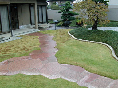 | 飛石(鉄平石、筑波石)から石張アプローチへの改修工事です。 |