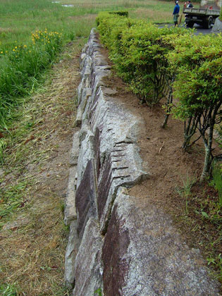 | 地面が石積みを30〜60センチ南に押出し、その上、石を起こし土は戻り、隙間ができた。石積み修復工事 |